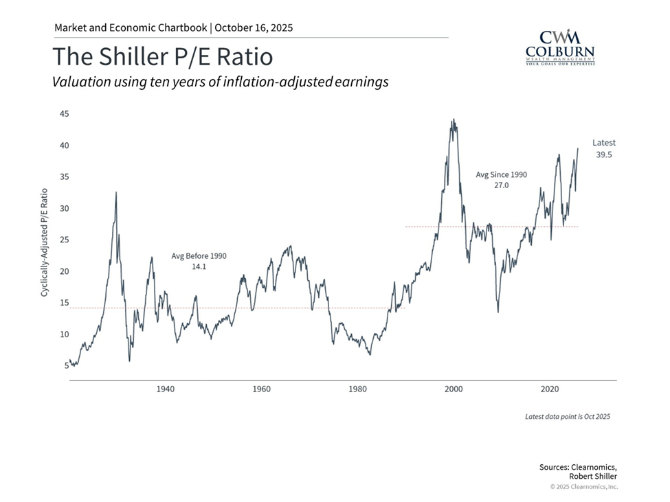 Take the Shiller P/E ratio, which smooths earnings over a decade and adjusts for inflation. Today’s level of ~38x is well above the historical average of 27x. That’s elevated—but not unprecedented. It reflects a market navigating inflation, policy shifts, and excitement around transformative tech like AI.