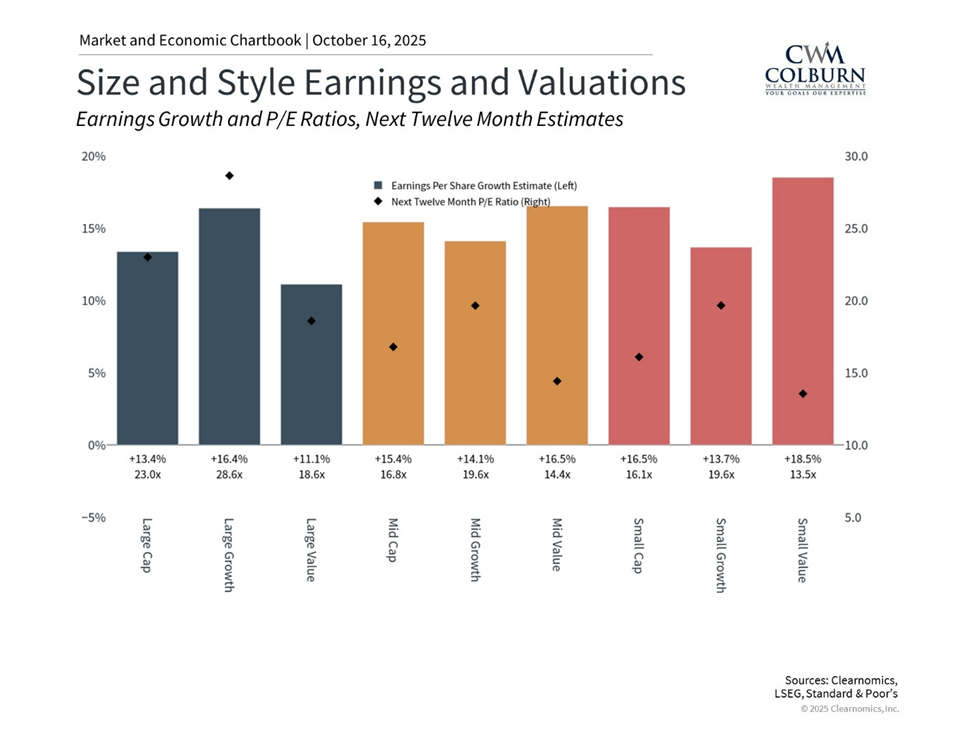 While large-cap growth stocks carry the highest valuations, other areas look more attractive. Large value and small caps, for example, offer healthier valuation profiles with solid earnings growth.