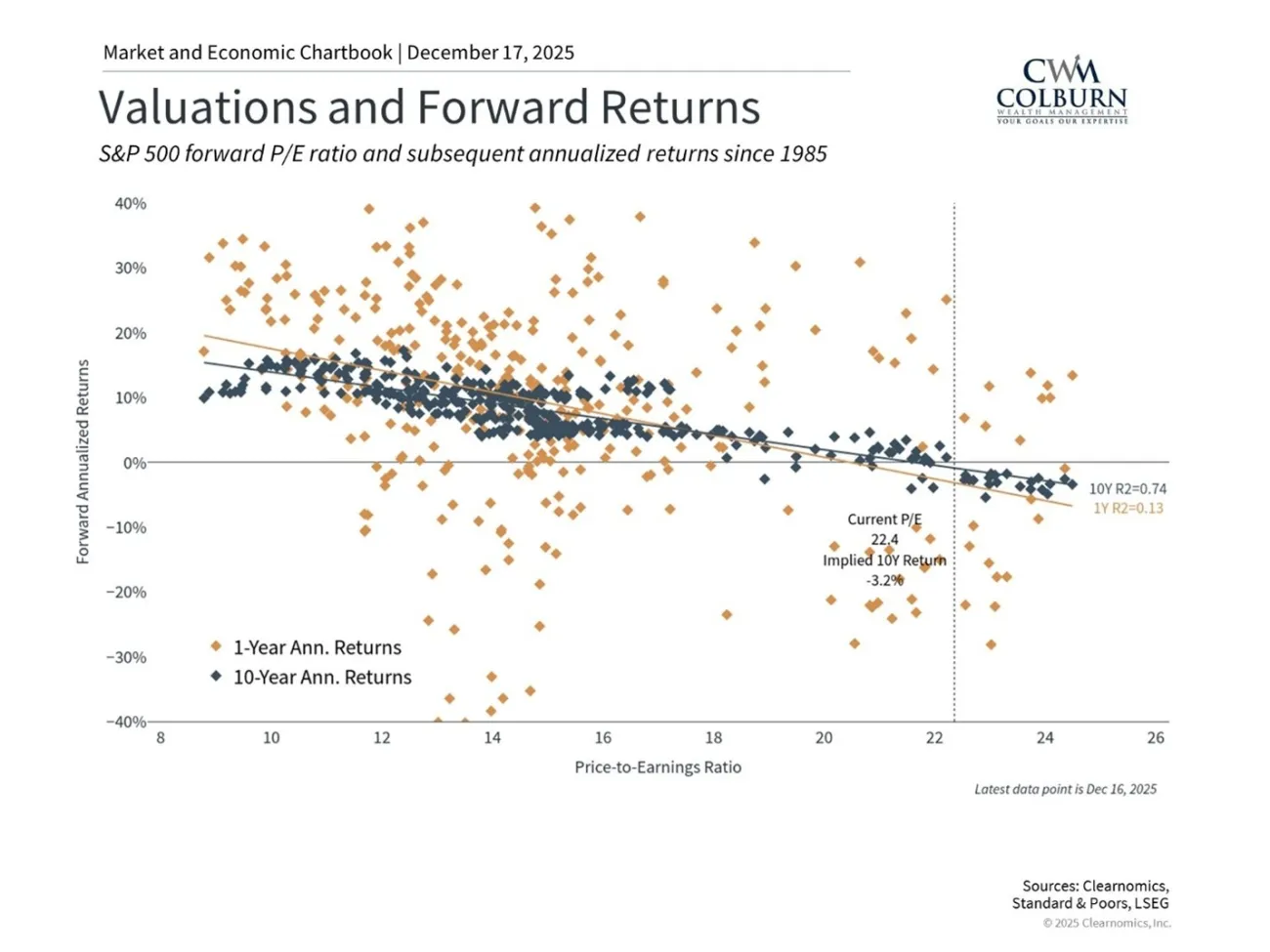 - The S&P 500 trades at ~22.5x earnings, close to the dot‑com peak of 24.5x.